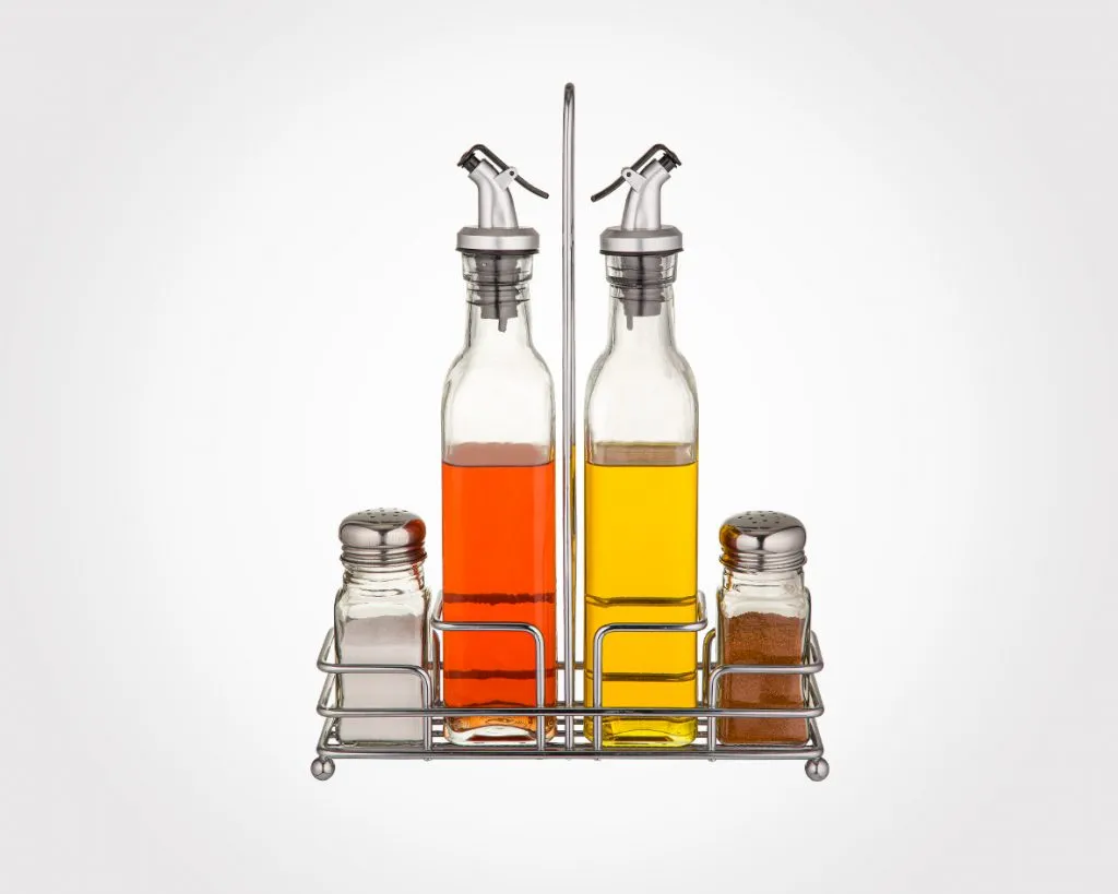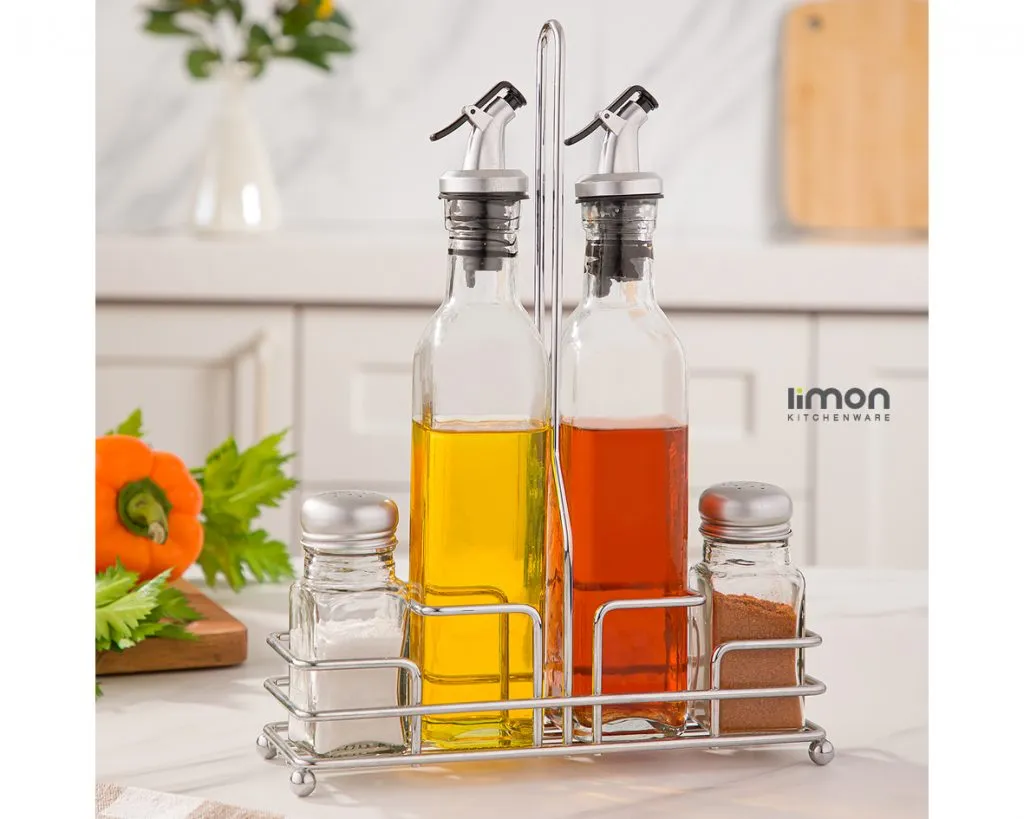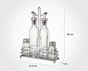 یک ست کاربردی برای میز غذا. این ست شامل دو بطری آبلیموخوری شیشهای و دو نمکپاش در پایهای مستطیل شکل است. مناسب سرویس غذاخوری روزمره یا مهمانی می باشد.