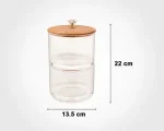 این شکلاتخوری دو طبقه با بدنه شیشهای و درب چوبی طبیعی، انتخابی شیک برای سرو شکلات، خشکبار یا حتی شیرینیهای خانگی است.